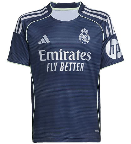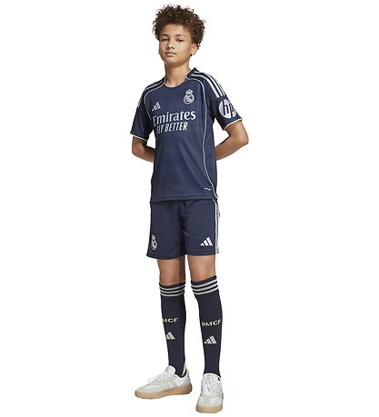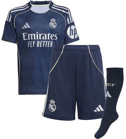 Great adidas Performance football clothing consisting of a t-shirt and a pair of shorts, as well as a pair of long, black socks. The T-shirt is in navy with the classic adidas stripes on both shoulders, and on the left sleeve there is an HP advertising print. The shirt has a distinctive advertising print of the main sponsor Emirates, and embroidered logos on the front. The Shorts are navy with logos embroidered on the front thighs and adidas stripes on the sides.