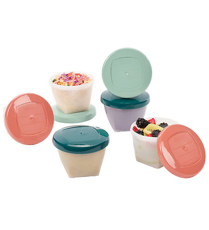 Fine Babymoov containers for food sold in a 6-Pack in plastic with lid in different colours. Each container has a capacity of 180 mL, and there is a graduated measuring scale on the side. They can be stacked when not in use.