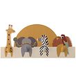 Cute Bloomingville coat rack in natural wood with a sun, lion, parrot, zebra, elephant, snake and giraffe on it. The wall hooks must represent the animals' tails.