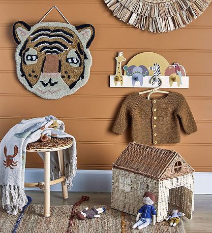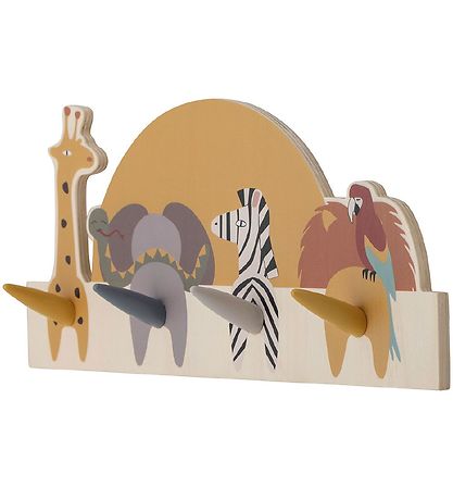 The Bloomingville coat rack consists of a long in wood board with five wall hooks, which can be used to hang outerwear or bag. The coat rack is shaped like the animals and in the middle there is a yellow sun. At the back of the coat rack there are two holes so that it can be hung on the wall.