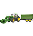 Cool Bruder tractor that is a realistic model of a John Deere 6920 tractor with trailer. The tractor is in a green and yellow color theme with a red trailer and appears completely like the real thing in the 1:16 scale.