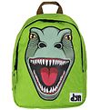 Cool DYR preschool backpack in light green with a cool print of a roaring dinosaur on the front. The bag has brown straps.