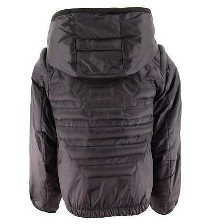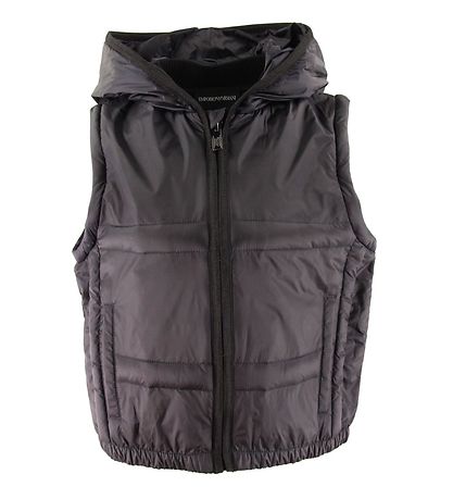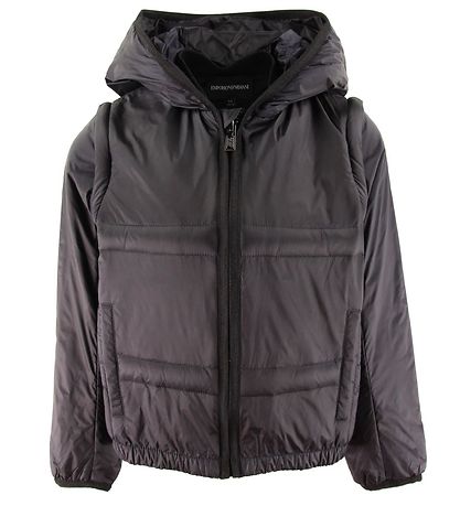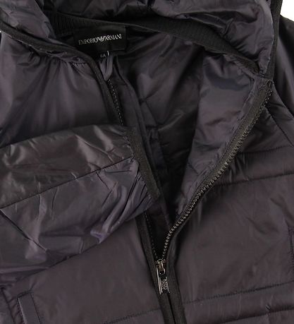 The Emporio Armani down jacket has a Fast hood and a wide ribbed neckline. The sleeves have narrow edges and a narrow elastic edge. The Jacket closes with a hidden zipper with an inner wind pole and there are open pockets at the front.