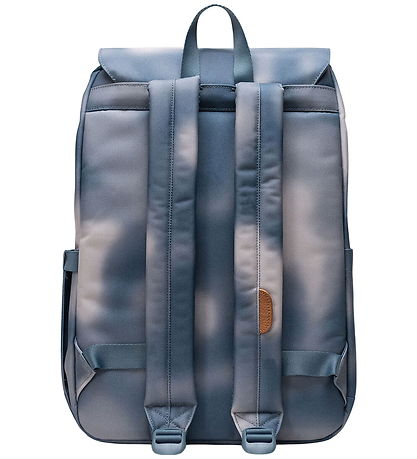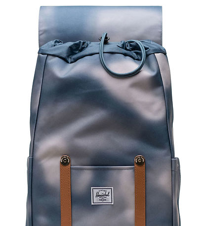 Practical Herschel backpack in blue and white shades with a white logo on the front and brown imitation leather straps.