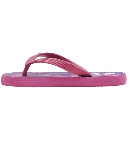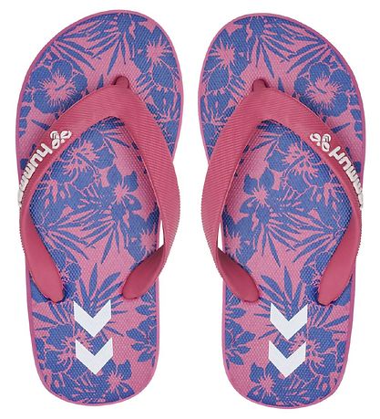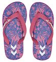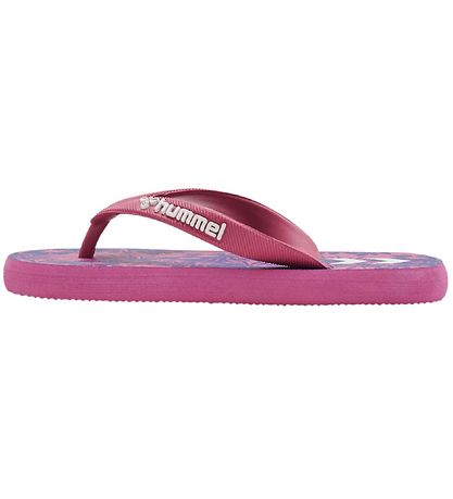 Fine Hummel flip flops in dark pink with a purple floral print and with white bumblebee angles on the heel.