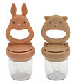 The food feeder consists of a silicone teat with small holes in which you can put different foods. When the kid chews on the pacifier, the food is squeezed out through the holes. Try, for example, melon, banana, boiled cauliflower and the like. The handle of the food feeder consists of round balls and is at the same time a teether that the baby can easily grasp and/or bite into.