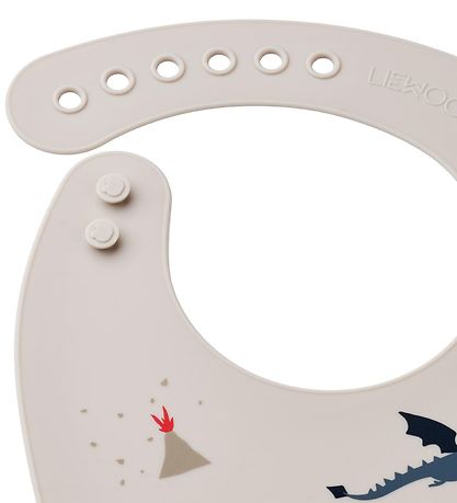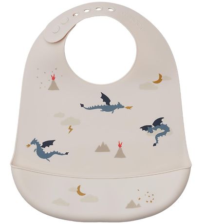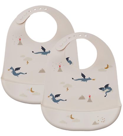 Beautiful Liewood bibs sold in a 2-Pack in beige with a print of dragons, volcanoes and clouds on the front.