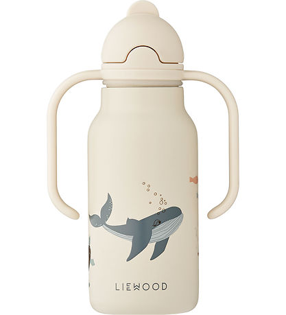 Nice Liewood water bottle in beige with a print of various sea creatures and a submarine in muted colours.