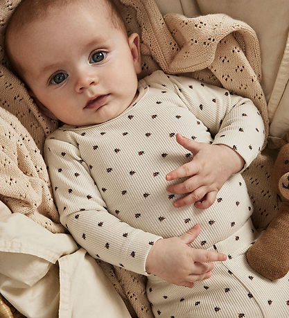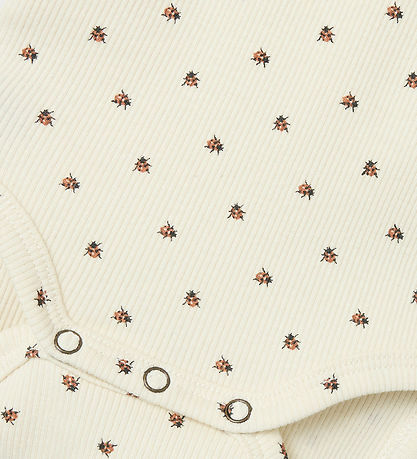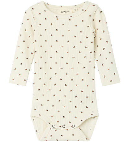Lovely bodysuit from Lil' Atelier in a beige shade with a nice allover print of little ladybugs. The Bodysuit has long sleeves and a button closure at the bottom, making it practical and comfortable for the little ones.