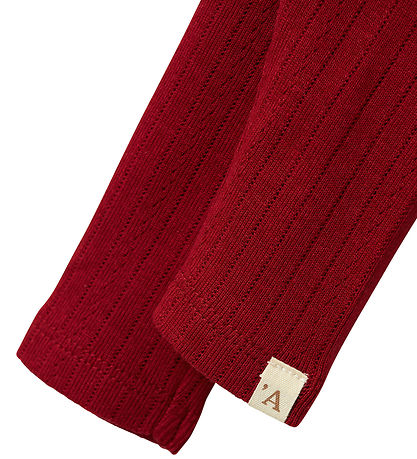 Beautiful Lil' Atelier leggings in a dark red colour with an elegant rib structure and pointelle. The Lil' Atelier leggings have an elastic waist adorned with a nice ruffle detail.
