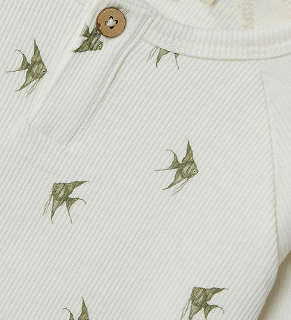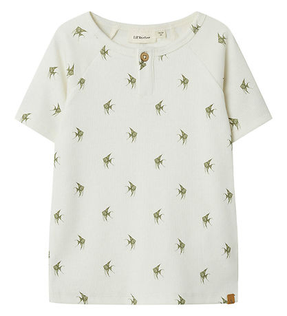 Charming Lil' Atelier t-shirt in a light cream color with a print of green fish. The T-shirt has a nice rib structure and a round neckline with a pull button at the front. It has card sleeves and a tight fit.