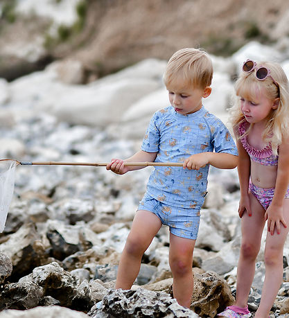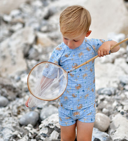 Fine Mikk-Line swim trunks in light blue with a check print and dotted with crabs, starfish and mussels.