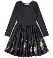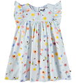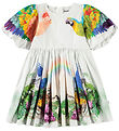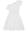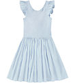 The upper set of the Molo dress has a ribbed structure and is made in a stretchable quality. At the top there is a narrow elastic with a wide ruffle edge, which goes over the left shoulder. At the waist there is a good elastic edge, which gives the skirt lovely folds. The skirt is made in a tightly woven cotton quality.