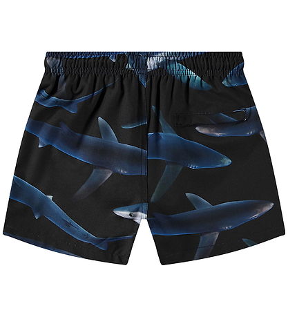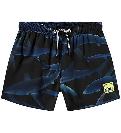 Great Molo swim shorts in black with a print of sharks in dark blue shades. The swim shorts have a good elastic at the waist, which can be adjusted with a lace. Inside there is a net with elastic in the leg openings.