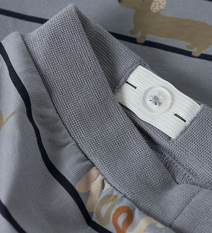 Nice trousers from Name It in grey blue with narrow horizontal stripes in dark blue and an all-over-print with dogs and the text "Woof". The Name It trousers are designed with an elastic waist, which can be adjusted inside with buttons and practical lace, which ensure a good fit. The trouser legs are finished with ribbed edges, which provide a tight and comfortable fit.