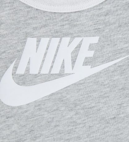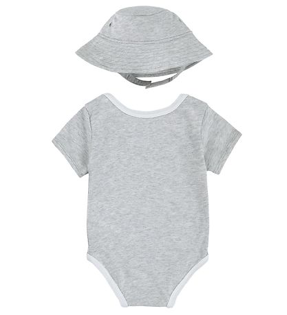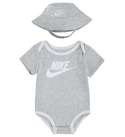 Cute Nike body set consisting of a bucket hat and a bodysuit. The Bodysuit is in melange grey with white edges and a white logo print on the chest. The Bucket hat is in melange grey with an embroidered logo on the front.