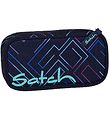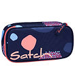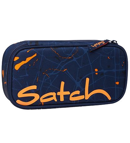 Cool Satch pencil case in navy with a pattern in blue and orange, and a print of "Satch" written with large, orange letters.