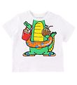 The Stella McCartney Kids T-shirt has short sleeves and a narrow ribbed edge in the neckline. It opens at the left shoulder with two push buttons.
