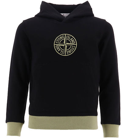 Nice Stone Island hoodie in black sweat, and the edge is dusty army green. A large logo is embroidered on the front in dusty army green.