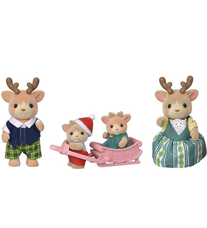Cute Sylvanian Families toy figurine in the shape of the Reindeer family, which consists of father, mother and two babies, who are all light brown reindeer and in fine clothes. A little sleigh is included, in which the two babies can sit and be pulled by mother or father.