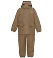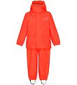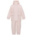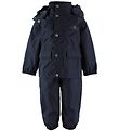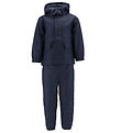 Beautiful Ver de Terre rainwear in navy PU. The set consists of a rain jacket and a pair of rain pants with suspenders.
