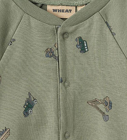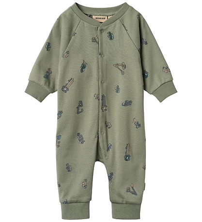 Beautiful Wheat jumpsuit in a subdued green colour with small motifs of different vehicles.
