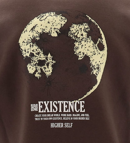 Smart Hound cardigan in dark brown sweat, and on the back is printed a large globe in light yellow and black together with a white text print.