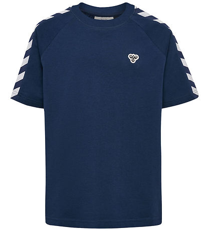 The T-shirt has the well-known Hummel logo on the chest, which adds a classic element. The shoulders and sleeves are adorned with the characteristic, white angle detail that Hummel is known for. The T-shirt has a round neckline with a narrow ribbed edge, which creates a nice detail.