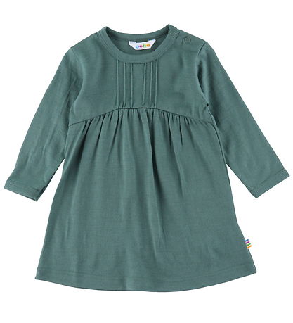 The Joha dress has long sleeves and a round neckline as well as fine details on the chest. The Dress can be opens on the left shoulder with its practical push buttons. The Dress has narrow, elastic stitching at the waist, which forms a nice and airy skirt. The Dress has an A-cut and is made of a soft and comfortable wool quality.