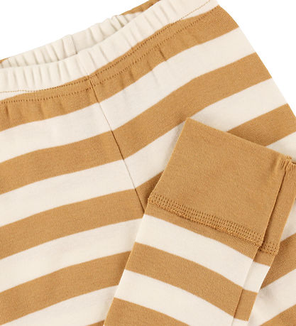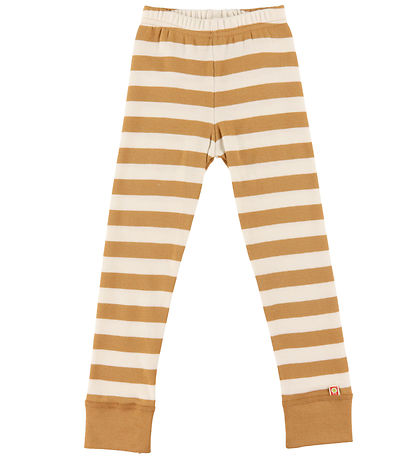 Cute Katvig leggings with horizontal stripes in caramel brown and white.