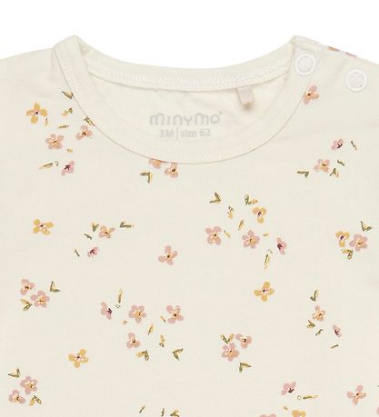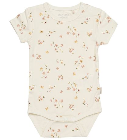 Beautiful Minymo bodysuit in white with all-over-print of pink, yellow and green flowers.