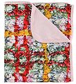 Beautiful Molo blanket with the fine print "Sugar Flowers" with large flowers in different shades of rose as well as green and purple leaves. The rug is grey melange on the back and has coral coloured edges.