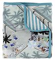 The blanket is in double layer cotton and comes with a slightly elastic band all around.