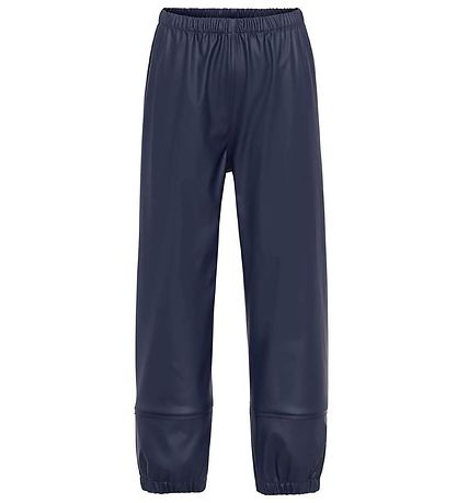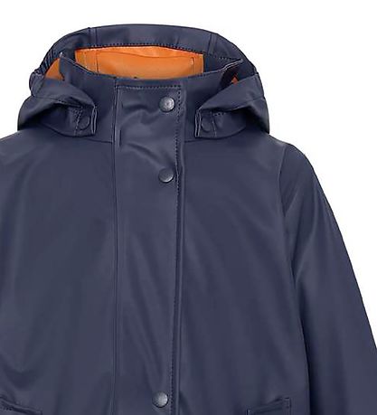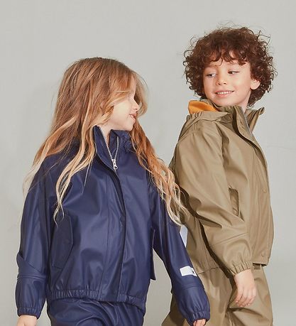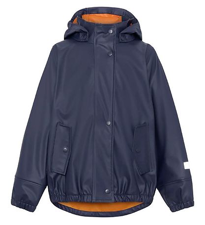 Smart Molo rainwear consisting of a pair of rain pants and a rain jacket in PU in plain navy. Inside there is a curry yellow lining. On the left sleeve and left leg, there are practical reflective prints.