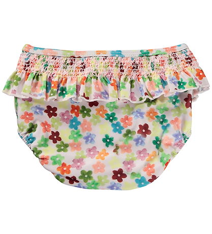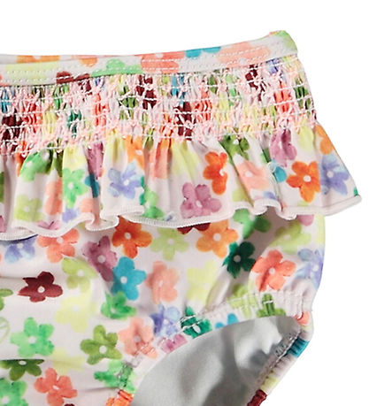 Stylish Molo swim trunks in white with a colorful floral print. The Swim trunks have a wide, elastic waist with a nice ruffle edge. The Swim trunks have elastic in the leg openings and space for a diaper underneath.