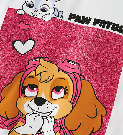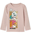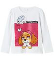 Cute Name It blouse with long sleeves in white. On the front you can see a print with a shiny, pink rectangle and motifs from Paw Patrol. The Blouse has a round neckline, which gives a classic look.