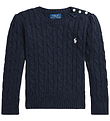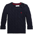 Beautiful Polo Ralph Lauren blouse in navy, and in front there is a large soft toy with clothes and embroidered details. the blouse is made in a nice, knitted quality.