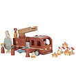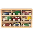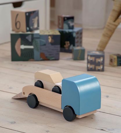 The Sebra car transporter and the car both have good wheels. The car transporter has a flap at the rear, which can be opens up so the car can be driven on and off. Both parts are in a good quality of solid wood.