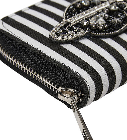 Beautiful Sofie Schnoor wallet with black and white stripes. On one side there is an application depicting a planet in black and white and decorated with rhinestone.