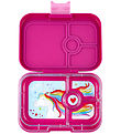 The Yumbox lunchbox has a square shape, and it has a fixed lid, which opens at the front with a clip. Inside, the lunchbox has a removable compartment divider with one large compartment, two smaller compartments and one little, round compartment for dipping or similar. In the lid, there is soft silicone, which closes tightly around the room divider.