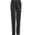 The adidas Performance trousers are equipped with an elastic waist and lace, ensuring a good fit. The legs are finished with elastic edges, and there is a white slogan print along one leg.