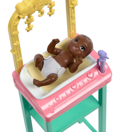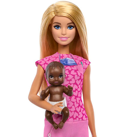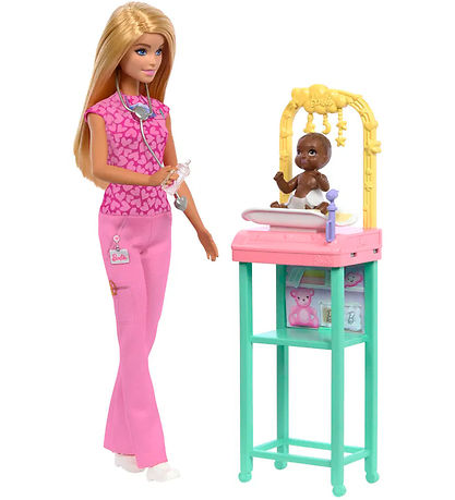 Beautiful Barbie doll depicting a pediatrician with long, blonde hair and blue eyes, wearing a pink doctor's kit and a stethoscope. Includes a baby scale, a baby, a feeding bottle, a blanket, and a thermometer.