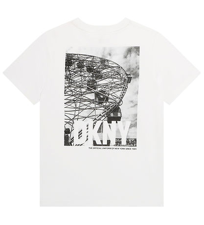 Nice DKNY t-shirt in white, with "DKNY" printed on the front in black. On the back there is a large photo print in shades of grey with a ferris wheel.