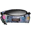 The Eastpak pencil case has a round and elongated shape with a flat bottom, and it opens at the top with a zipper.