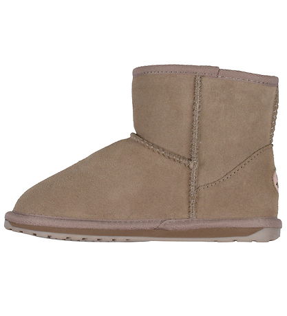 Fine EMU Australia teddy boots in plain beige suede with decorative stitching.