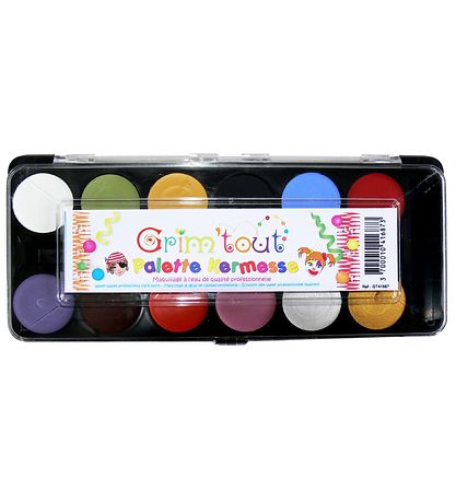 The Grim Tout face paint set consists of 12 colours and 1 brush. The paint is water-based, fragrance-free and free of parabens. It is easily removed with soap and water.