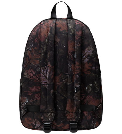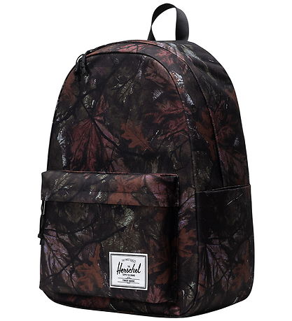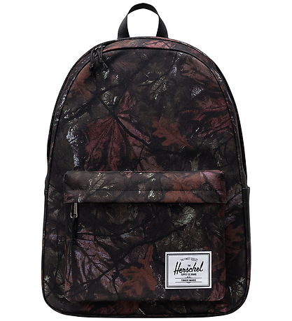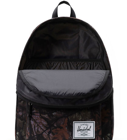 Nice Herschel backpack with an allover print of leaves in black, brown and grey shades. There is a white logo patch on the front, and the inside of the backpack has a dark striped lining.