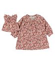 The Hust and Claire bodysuit has long sleeves and a round neckline with decorative lace trim. The body of the dress opens over the left shoulder with hidden push buttons and between the legs with regular push buttons. At the waist there is an elastic seam, which forms a fine skirt with width and pleats, so that the bodysuit looks like a dress and it is made in a soft and stretchable cotton quality.
