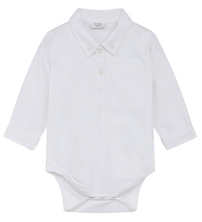 The Hust and Claire shirt body has long sleeves with a slit and button closure and a classic, turned collar at the neck. The Bodysuit is opened at the post closure at the front with two buttons and between the legs with ordinary push buttons. In front, there is a decorative breast pocket on the left side and the bodysuit is made of a soft and stretchy cotton quality.