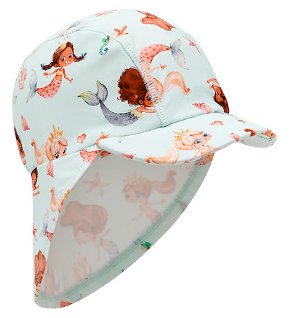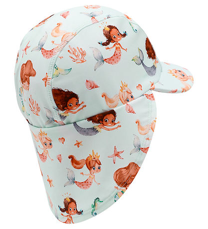 Beautiful Hust and Claire swim hat in light mint green with a colorful print of mermaids and sea motifs.